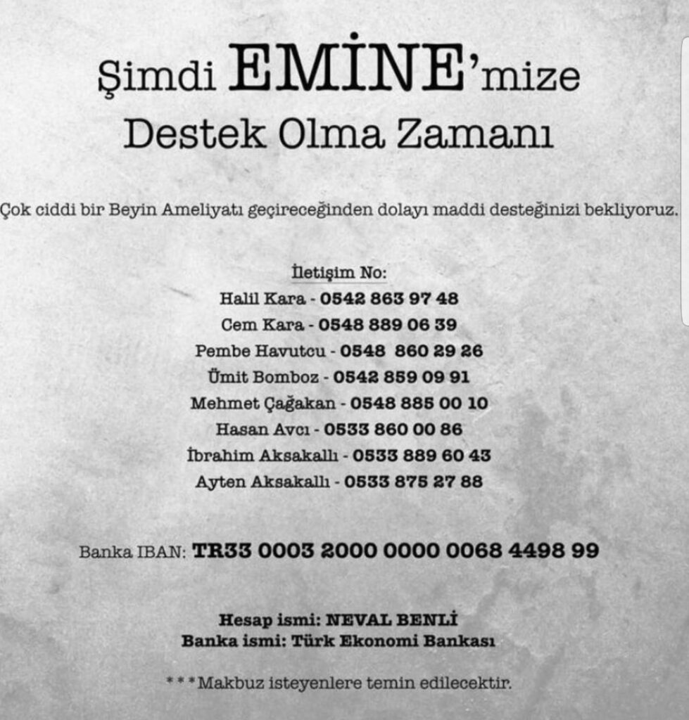 4 yaşındaki Emine Benli’nin acil ameliyat olması gerekmektedir. Ameliyat parası için çok acil maddi yardım desteğine ihtiyacımız vardır. Eminemiz en geç Perşembe günü ameliyat olmak zorunda olduğundan duyarlılığınızı rica ederiz. Parayı bize ya elden yada banka hesap numarasına yatırabilirsiniz.İletişim : 05338752788, IBAN:TR330003200000000068449899 NEVAL