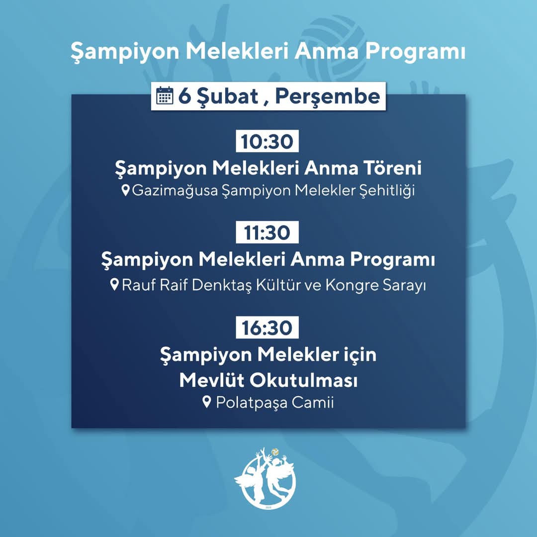 Şampiyon Melekleri Anma töreni saat 10.30’da Gazimağusa Şampiyon Melekler Şehitliği’nde düzenlenecek. Ardından saat 11.30’da Gazimağusa Rauf Raif Denktaş Kültür ve Kongre Sarayı’nda Şampiyon Melekleri Anma Programı gerçekleştirilecek. Aynı gün saat 16.30’da Gazimağusa Polatpaşa Cami’de Şampiyon Melekler için mevlit okutulacak.