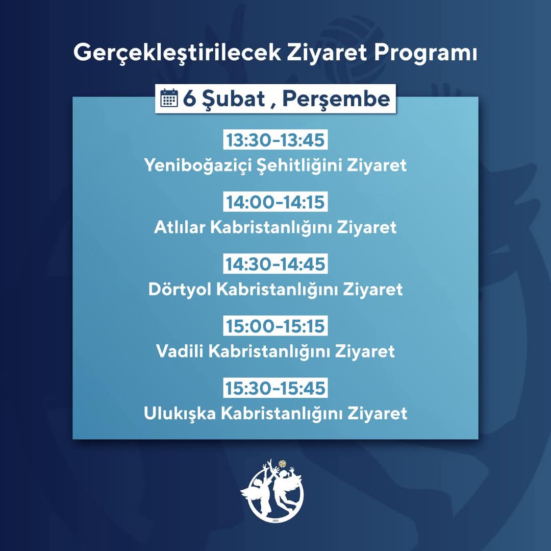 Yeniboğaziçi Şehitliği’nde Mülkiye Dağlı, Abide Dağlı, Nazife Dağlı, Osman Çetintaş ile Havin Kılıç’ın kabirleri 13.30-13.45 saatlerinde, Atlılar Kabristanlığında Perihan Çetiner’in kabri 14.00-14.15 saatlerinde, Dörtyol Kabristanlığı’nda Bedriye Yeniçeri ve Ecem Yeniçeri’nin kabri 14.30-14.45 saatlerinde, Vadili Kabristanlığı’nda İbrahim Yakula’nın kabri 15.00-15.15 saatlerinde ve Ulukışla Kabristanlığı’nda Kaan Selim İş’in kabri 15.30-15.45 saatlerinde ziyaret edilecek.
