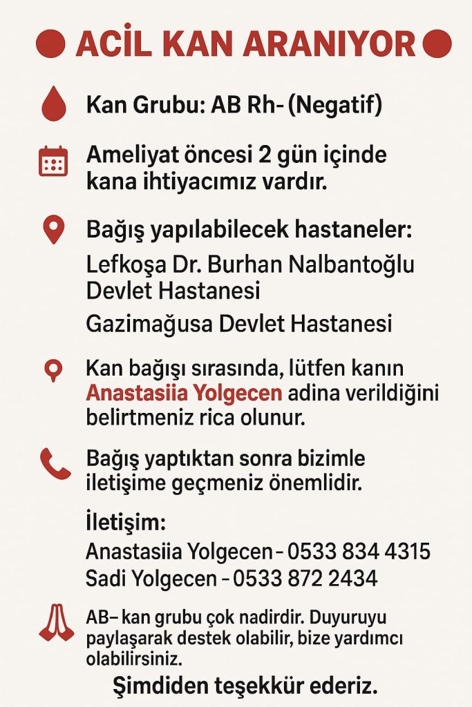 FeaturedKIBRISAcil AB Rh negatif kan aranıyor!Published on: 5:01 pm Yazar Voice Kıbrıs HaberTemmuz 21, 20250 Paylaş0 İki gün sonra ameliyat olacak olan Anastasiia Yolgeçen için acil AB Rh- (Negatif) kana ihtiyaç olduğu duyuruldu.Duyuru şu şekilde: