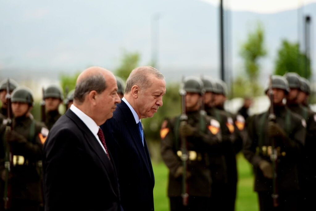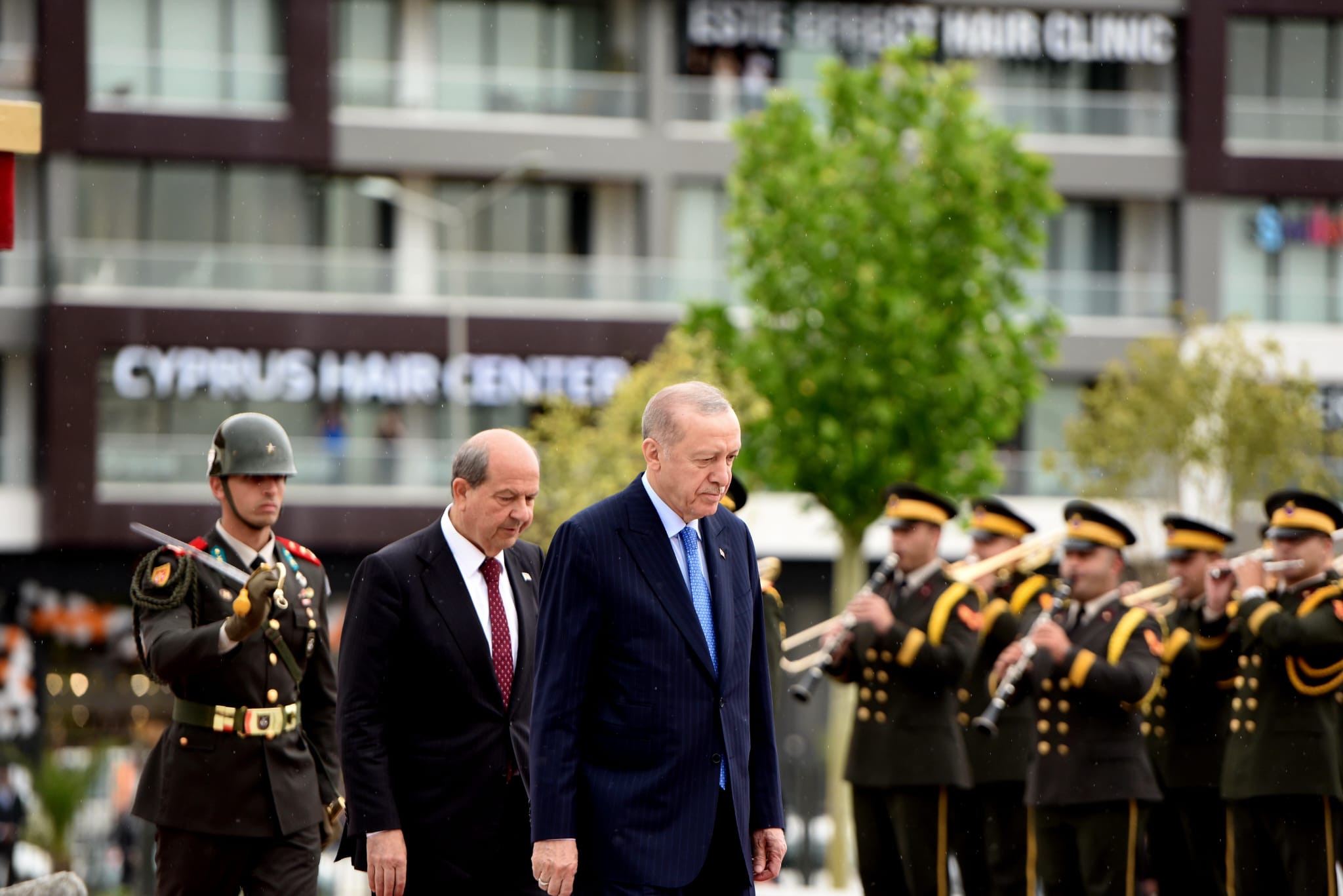 Cumhurbaşkanı Ersin Tatar, yapımı tamamlanan Cumhuriyet Yerleşkesi’nin açılışını gerçekleştirmek üzere Kuzey Kıbrıs Türk Cumhuriyeti’ne gelen Türkiye Cumhuriyeti Cumhurbaşkanı Recep Tayyip Erdoğan’ı resmi törenle karşıladı.