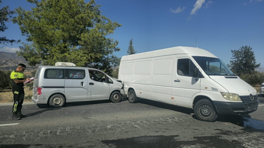 24.10.2025 tarihinde, saat 13.00 sıralarında, Ercan-İskele Anayolu’nun 3-4’üncü kilometreleri arasında, 55 yaşındaki erkek sürücü yönetimindeki SF 896 plakalı salon araç ile doğu istikametine doğru dikkatsiz şekilde seyrettiği sırada, önünde aynı istikamete doğru seyreden araçları geçmeye çalışırken o esnada karşı istikametten gelmekte olan sürücüsü ve plakası meçhul aracın geliş yolunu tıkamış ve kimliği meçhul sürücünün aniden yavaşlaması sonucu ise, o esnada gerisinden gelmekte olan 38 yaşındaki erkek sürücü yönetimindeki FM 011 plakalı van aracı durduramayarak yolun sağ şeridine geçmiş ve karşı istikametten gelmekte olan 48 yaşındaki kadın sürücü yönetimindeki UT 815 plakalı salon aracın sağ yan kısmına çarpmıştır. Çarpışmanın etkisiyle yolun solundan dışarıya çıkan UT 815 plakalı araç, beton hendek içerisine düşerek bir takla attıktan sonra tavanı üzerinde durmuştur.