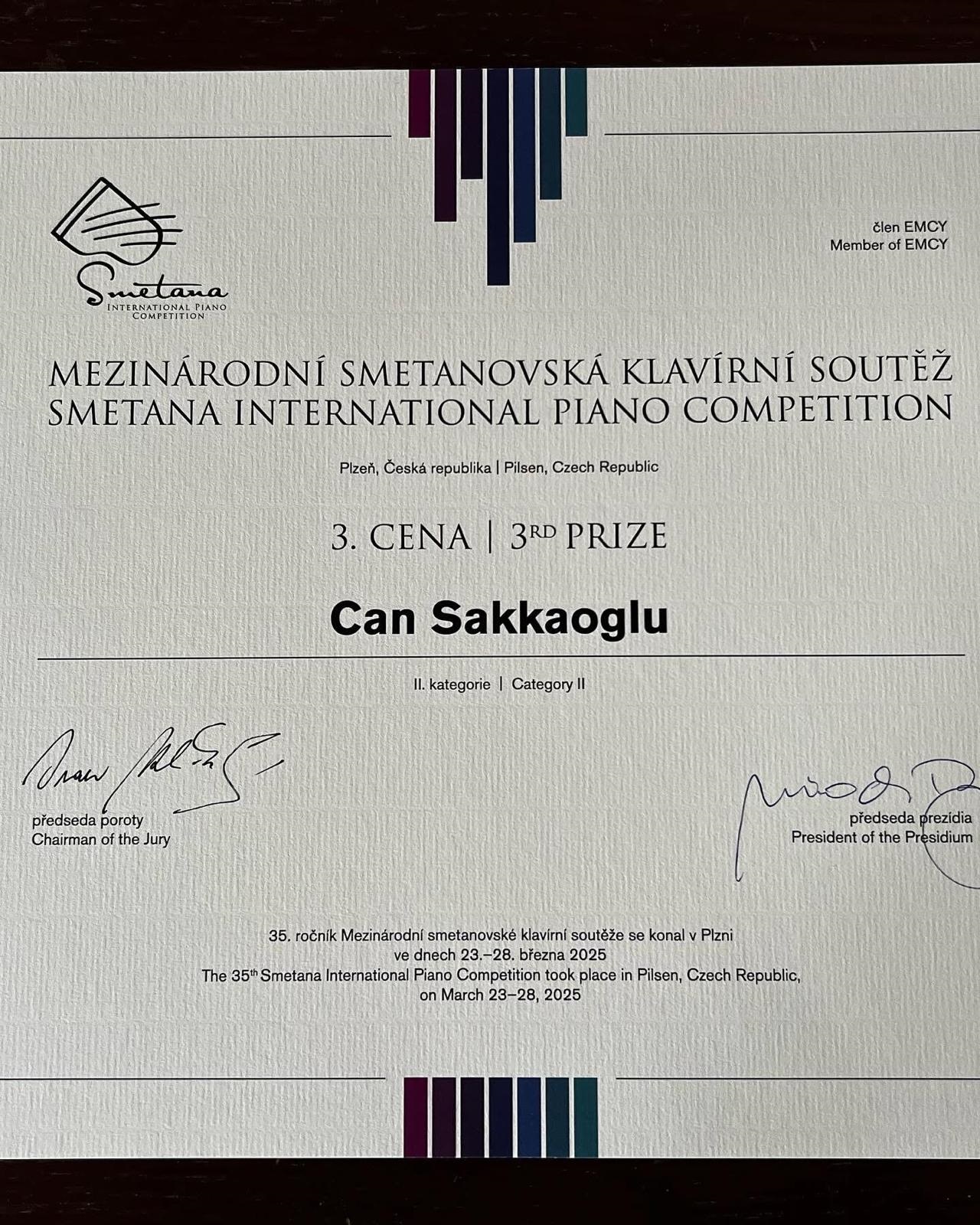 Genç piyanist Can Sakkaoğlu, Çek Cumhuriyeti’nin Pilsen kentinde düzenlenen 35. Uluslararası Smetana Piyano Yarışması’nda üçüncülük ödülünü kazandı.