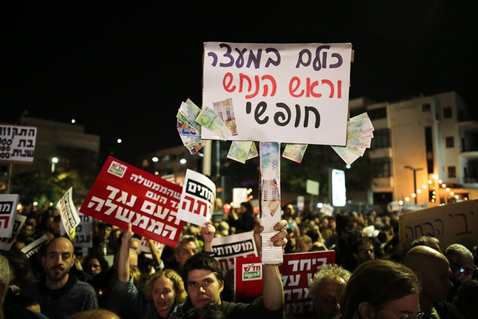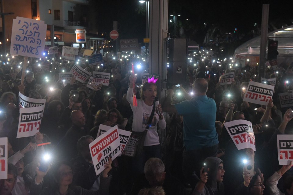 “Netanyahu’yu yolsuzluk davasından kurtarmak” için hazırlandığı eleştirilerine yol açan, polisin üst düzey devlet yöneticileriyle ilgili soruşturmalarda savcılara dava açma tavsiyesinde bulunma yetkisini elinden alan yasa tasarısına karşı öfkelerini dile getiren kalabalık, Netanyahu’nun hapse atılması yönünde taleplerini dile getirdi.
