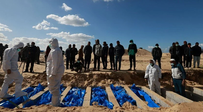 Aylardır devam eden katliamda öldürülen binlerce insan için mezarlıklarda yer bulamayan Gazze halkı cenazelerini toplu mezarlara gömmek zorunda kalıyor.
