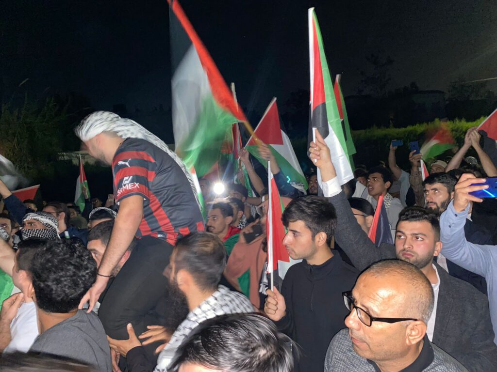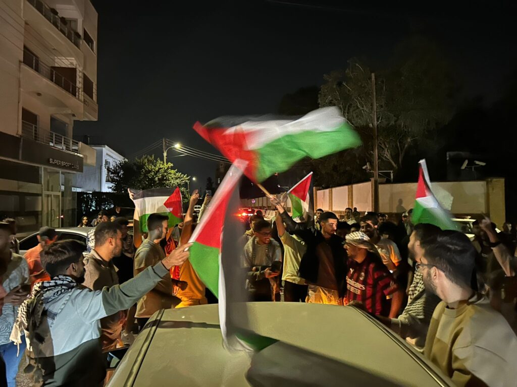 Türkiye, KKTC ve Filistin bayrakları taşıyan protestocular, okudukları basın bildirisinde İsrail’in bebek, çocuk, kadın ve erkek ayrımı yapmadan Filistinli sivilleri canlı yayında hastaneye yaptığı saldırı ile katlettiği belirtilerek, uluslararası toplumdan Gazze’ye yönelik saldırıları durdurmasını istendi.