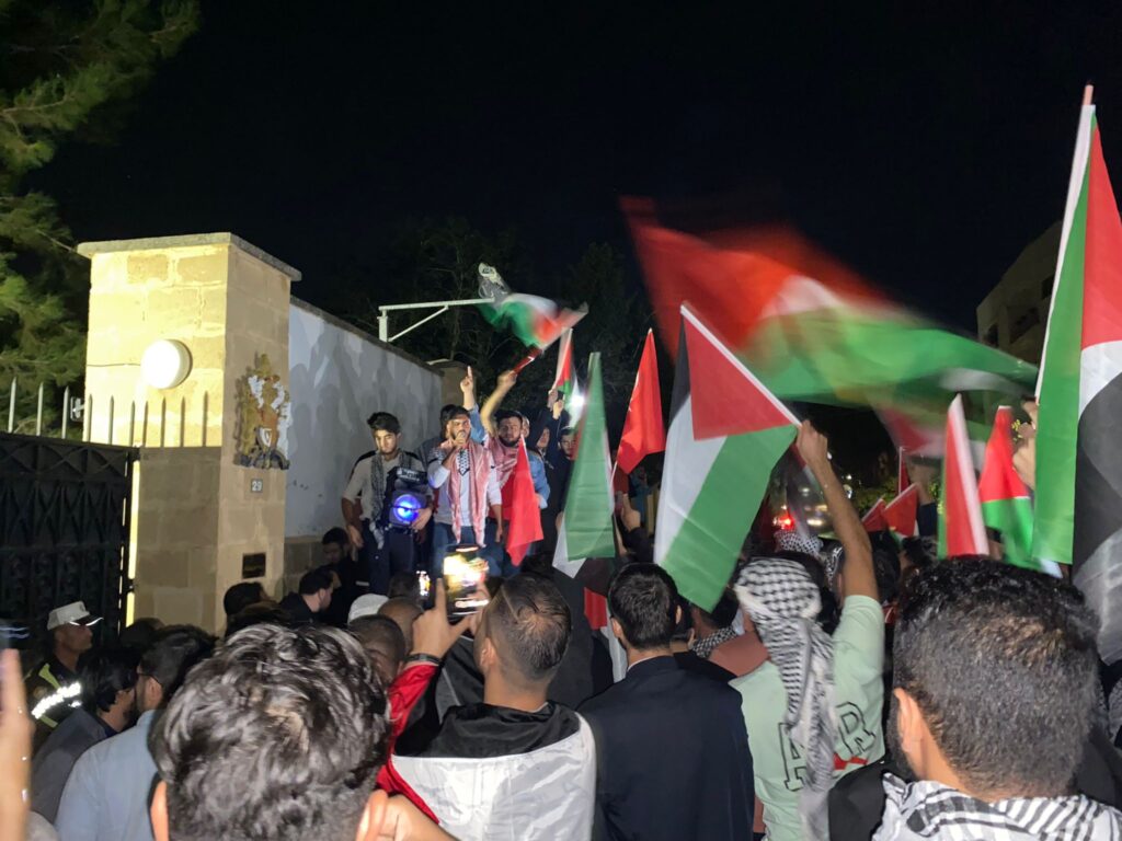 İsrail’in hastane saldırısına tepki gösteren bir grup, Lefkoşa’daki İngiliz Yüksek Komiserliği ofisi önünde toplanarak slogan attı.