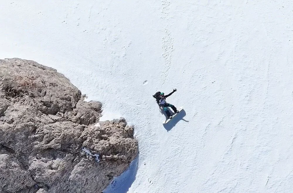 Yaklaşık 4 saat süren zorlu tırmanışla zirveye ulaşan kayakçılar, bir süre mola verdikten sonra yüksek eğimli bölgeden snowboard ile slalom yaparak inmeye başladı.