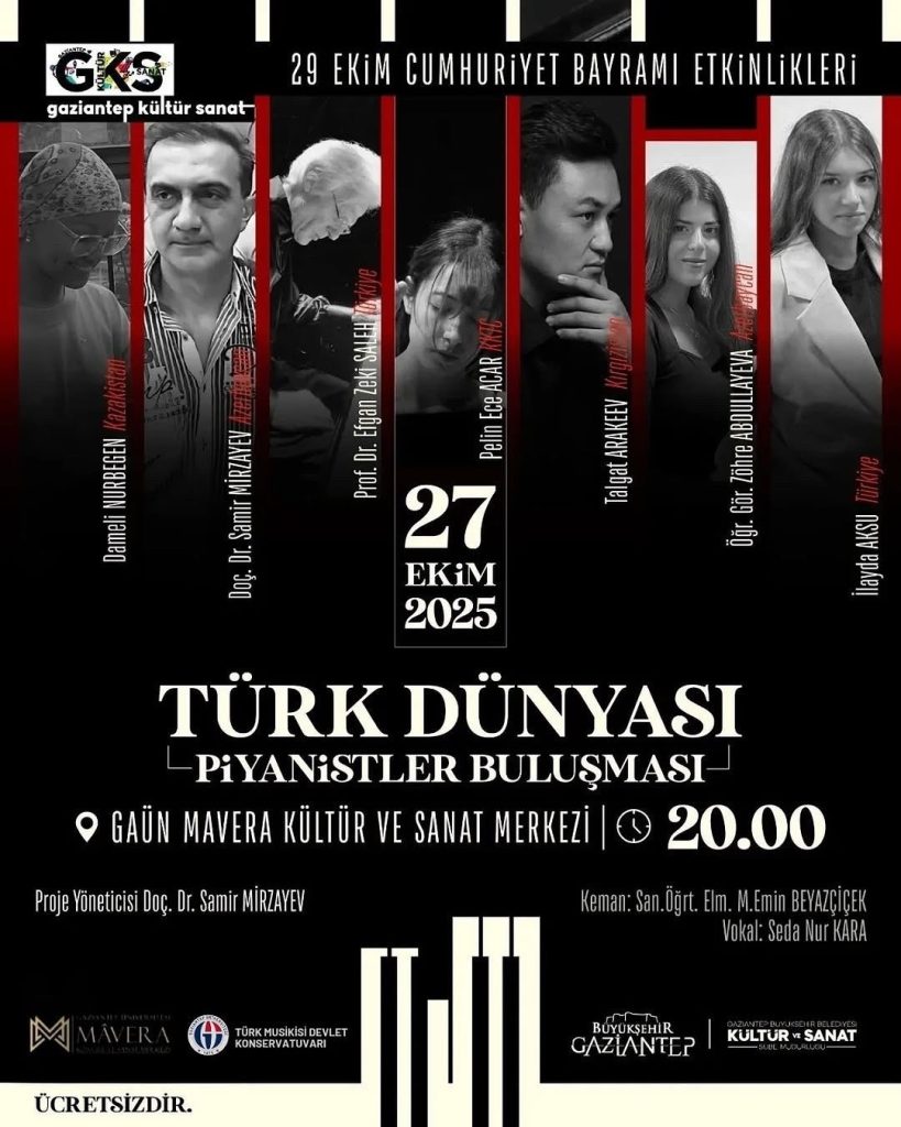 Gaziantep Üniversitesi Mavera Kültür ve Sanat Merkezinde gerçekleşecek piyano konserine Dameli Nurbegen (Kazakistan), Doç.Dr.Samir Mirzayev (Azerbeycan), Prof.Dr.Efgan Zeki Saleh (Türkiye), Pelin Ece Acar (KKTC), Talat Arakev (Kırgızistan), Öğr. Gör. Zühre Abdullayeva (Azerbeycan), İleyda Aksu (Türkiye) katılacak. Etkinlikte Pelin Ece Acar M.Ravel’in Gaspard de la Nuit.no 1 “Ondine” ve A.Ratip’in Love Melodies II no.1 “First Love” isimli parçasını seslendirecek.