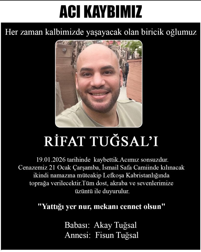 Tuğsal’ın cenazesi yarın (21 Ocak Çarşamba) İsmail Safa Camii’nde kılınacak ikinci namazının ardından Lefkoşa Mezarlığı’na defnedilecek.