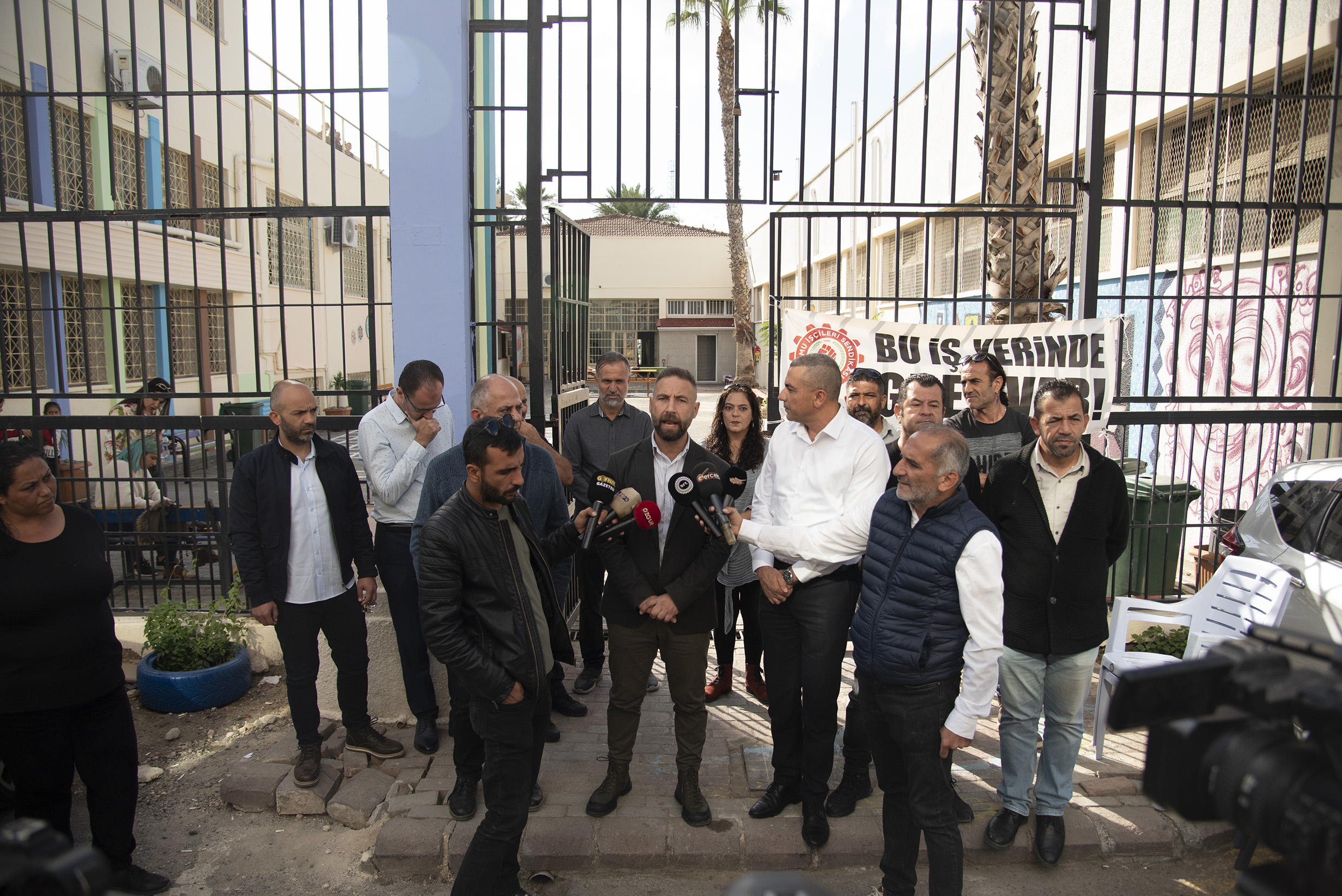 Basın açıklamasına KTÖS Genel Sekreteri Burak Maviş, KTOEÖS Başkanı Mustafa Baybora ve Kamu-İş Başkanı Ahmet Serdaroğlu ile sendika yetkilileri katıldı.
