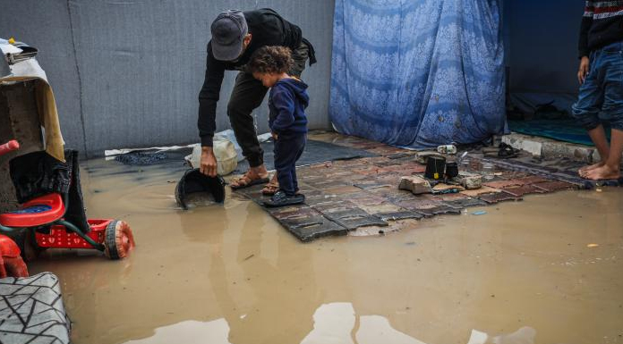 Eşyaları su altında kalan ve soğuktan korunma imkânlarını da yitiren Filistinliler, yetkililerden acil yardım talebinde bulundu.