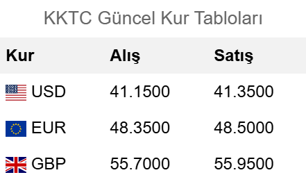 EkonomiFeaturedSterlin 56 TL sınırında!Published on: 8:36 pm Yazar Voice Kıbrıs HaberEylül 8, 20250 Paylaş0 KKTC serbest piyasalarında sterlin- dolar – euro kaç TL? 8 Eylül 2025 döviz kurları en son ne kadar oldu?Dolar/TL 41.35 lira civarında hareket ediyor.Euro/TL 48.50 lira bandında seyrediyor.Sterlin/TL ise 55.95 lira civarında yer alıyor.