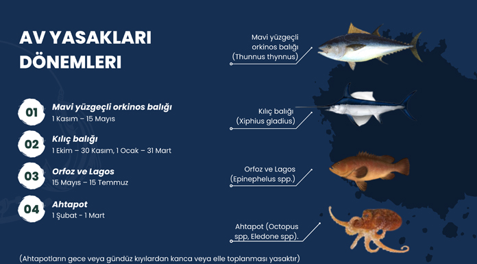 Açıklamada, “Balıkçılık İzinleri ve Balıkçılık Kaynaklarının Sürdürülebilir Kullanımı Tüzüğü” kapsamında avlanılması yasak türler ve tarihleri şöyle kaydedildi: “Mavi yüzgeçli orkinos balığı 1 Kasım- 15 Mayıs; kılıç balığı 1 Ekim – 30 Kasım ve 1 Ocak – 31 Mart; orfoz ve lagos 15 Mayıs – 15 Temmuz ve ahtapot 1 Şubat – 1 Mart.”