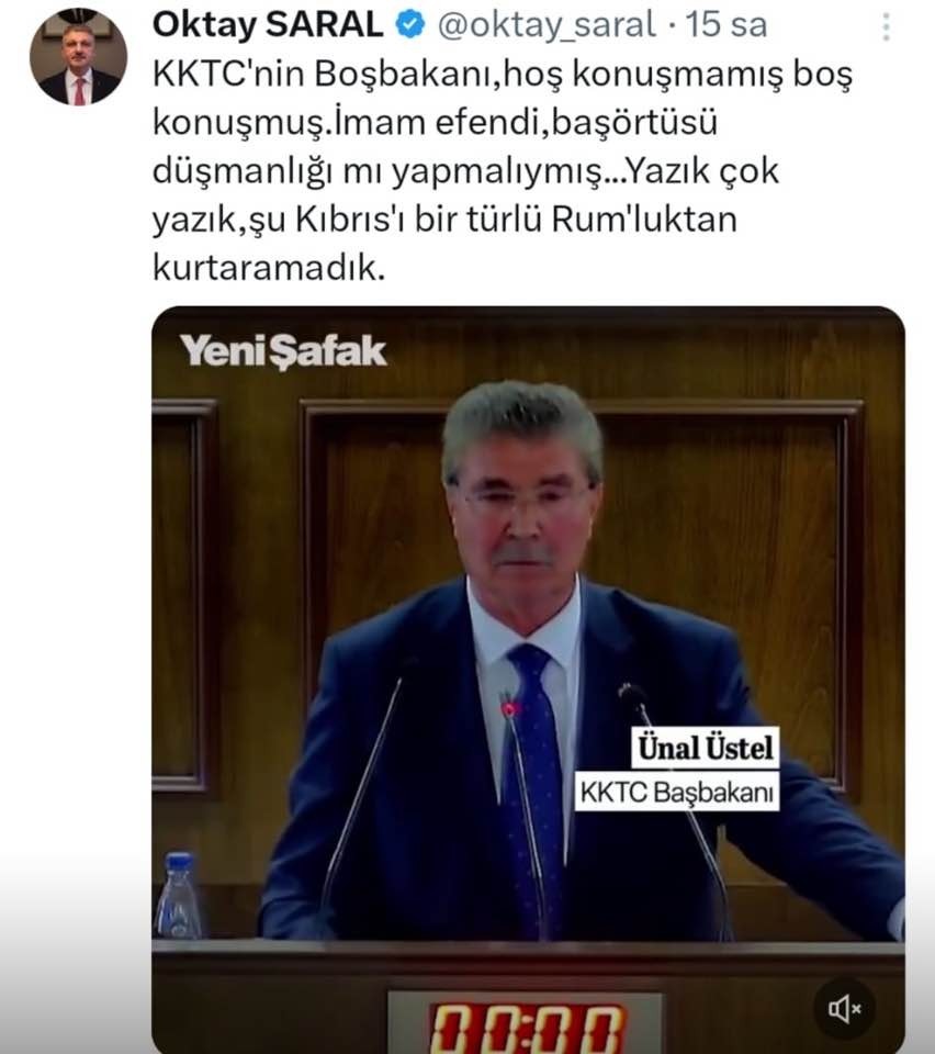 Saral, X hesabından yaptığı paylaşımda “KKTC’nin Boşbakanı, hoş konuşmamış boş konuşmuş. İmam efendi, başörtüsü düşmanlığı mı yapmalıymış…Yazık çok yazık, şu Kıbrıs’ı bir türlü Rum’luktan kurtaramadık” ifadelerine yer verdi.