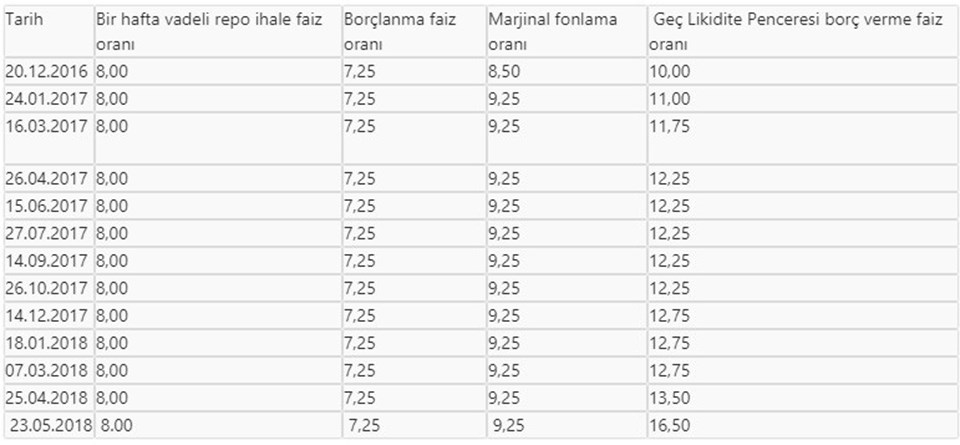 Merkez Bankası’nın Aralık 2016’dan bu yana uyguladığı bir hafta vadeli repo ihale faiz oranları, borçlanma faiz oranları, marjinal fonlama oranları ve GLP borç verme faiz oranları (yüzde) şöyle: